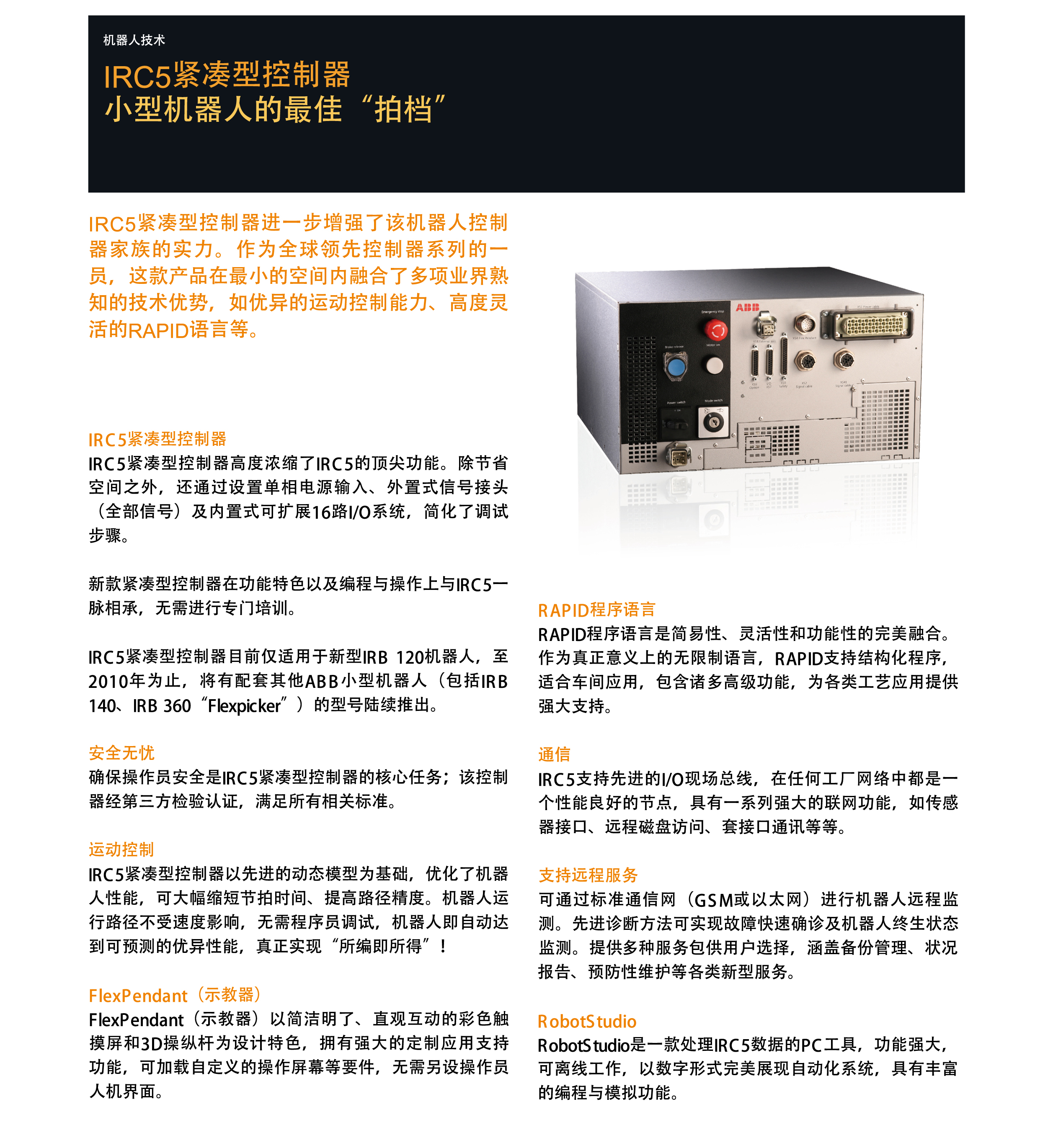 IRC5C將IRC5控制器的強(qiáng)大功能濃縮于緊湊的機(jī)柜內(nèi);節(jié)省空間,單相電源便于調(diào)試。