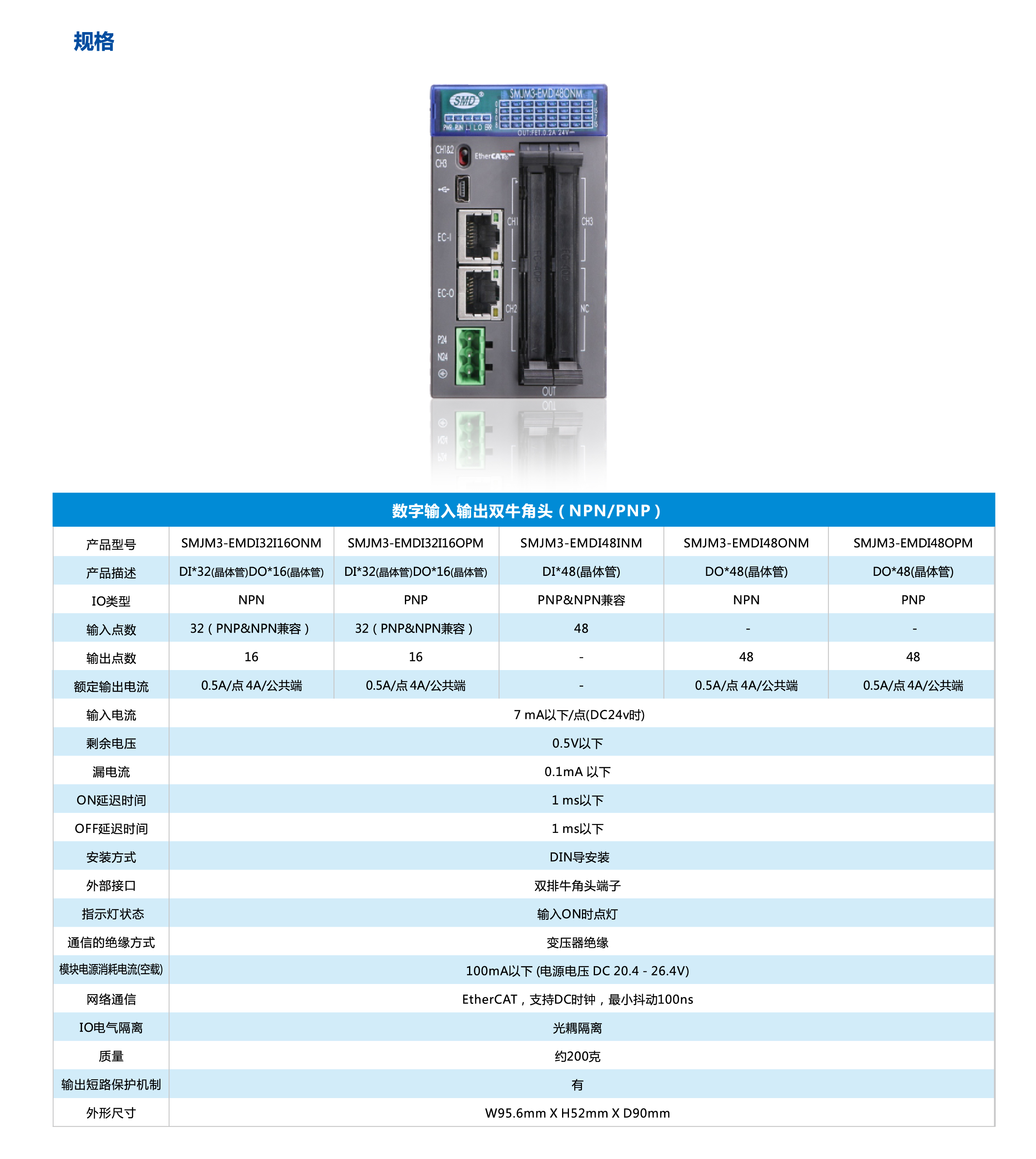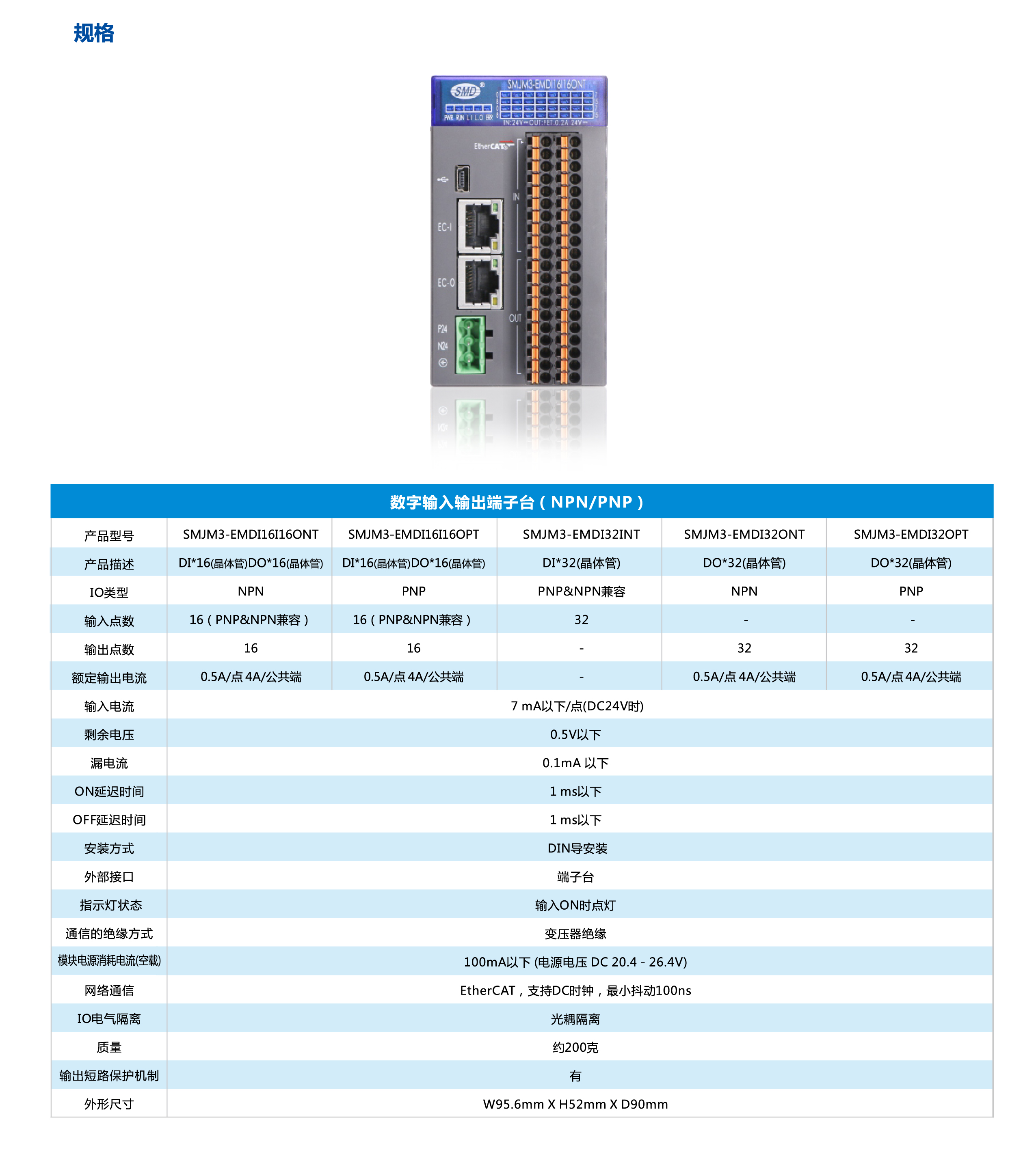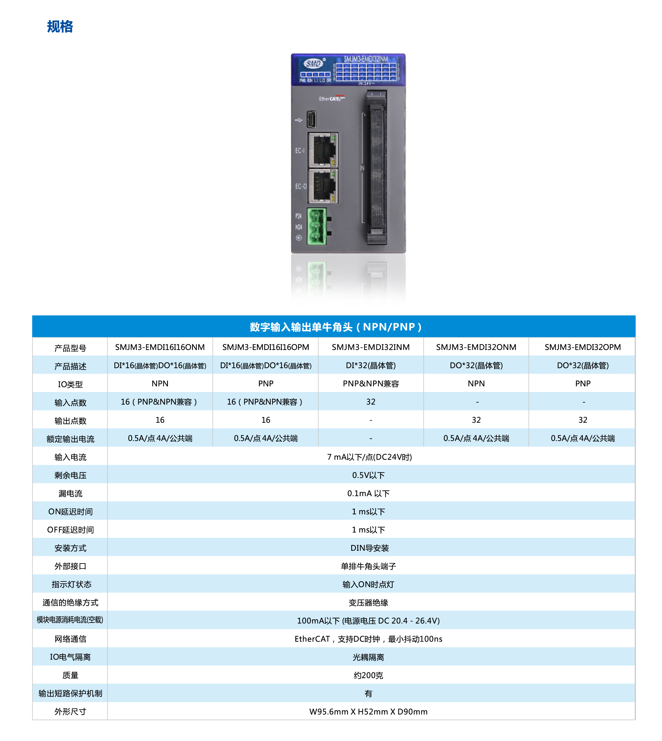 少點數(shù)及多點數(shù)遠程IO是速美達自主研發(fā)的一款總線產(chǎn)品。將通訊端口,電源模塊,IO模塊集成在單個模塊上。其擁有體積小、結(jié)構(gòu)緊湊、 接線簡單、 接線接口豐富、 性能穩(wěn)定、 可靠等特點。目前支持EtherCAT 總線,后續(xù)會增加CC-LINK,PROFINET等總線接口。有多種型號類型以及輸入輸出點可供選擇,單個模塊最大可支持48個信號點。