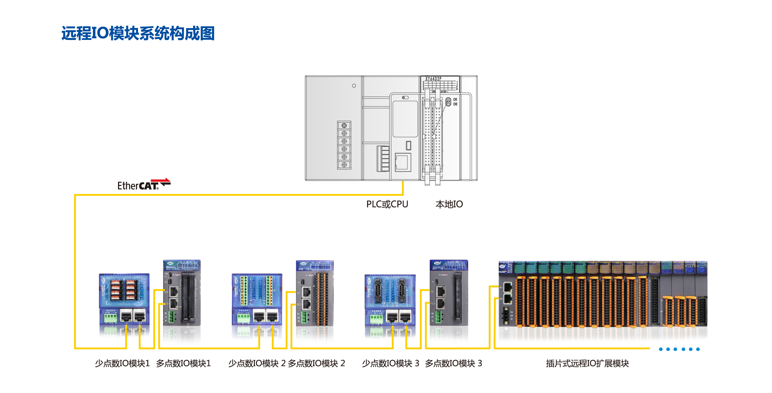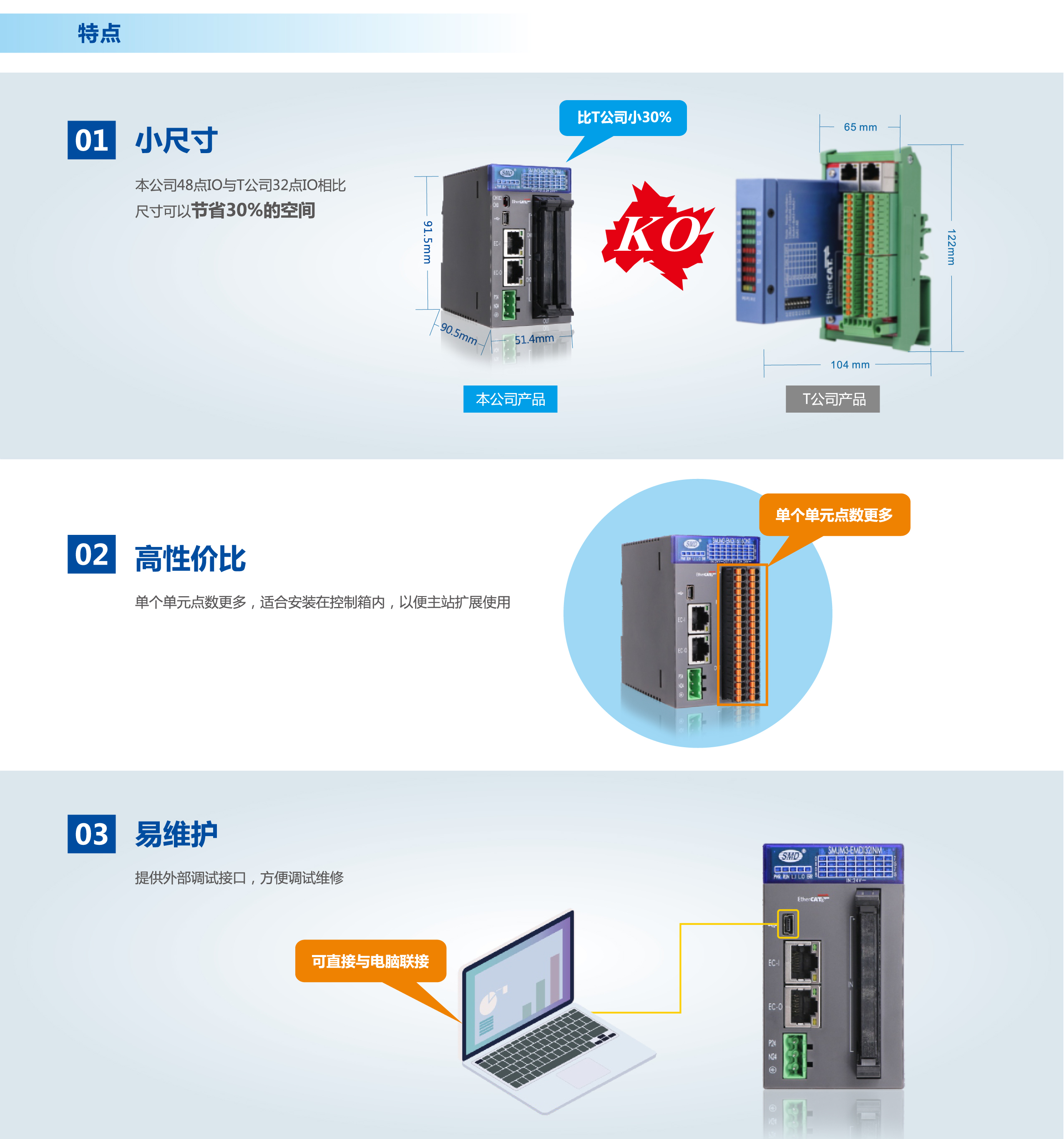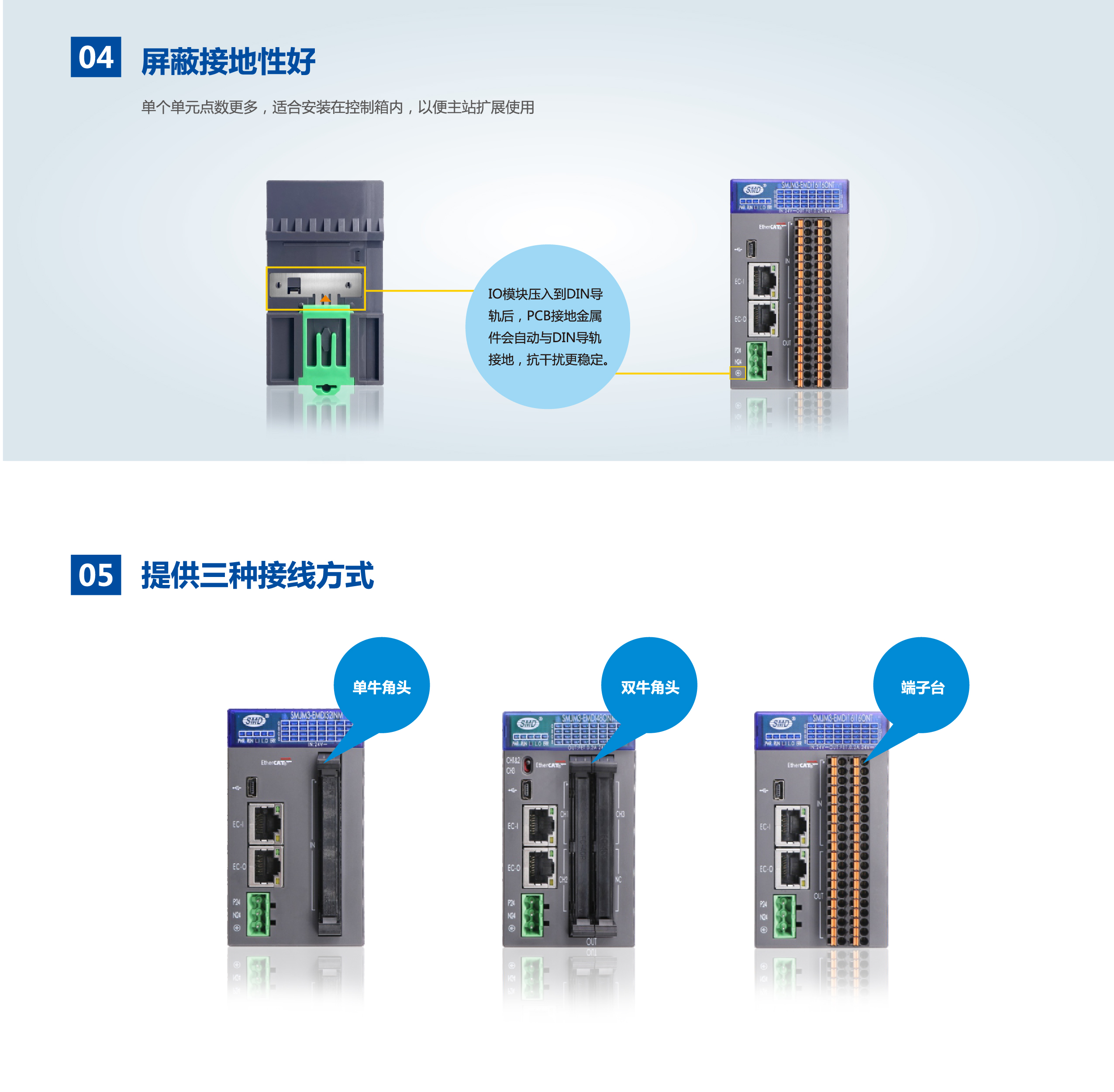 少點數(shù)及多點數(shù)遠程IO是速美達自主研發(fā)的一款總線產(chǎn)品。將通訊端口,電源模塊,IO模塊集成在單個模塊上。其擁有體積小、結(jié)構(gòu)緊湊、 接線簡單、 接線接口豐富、 性能穩(wěn)定、 可靠等特點。目前支持EtherCAT 總線,后續(xù)會增加CC-LINK,PROFINET等總線接口。有多種型號類型以及輸入輸出點可供選擇,單個模塊最大可支持48個信號點。