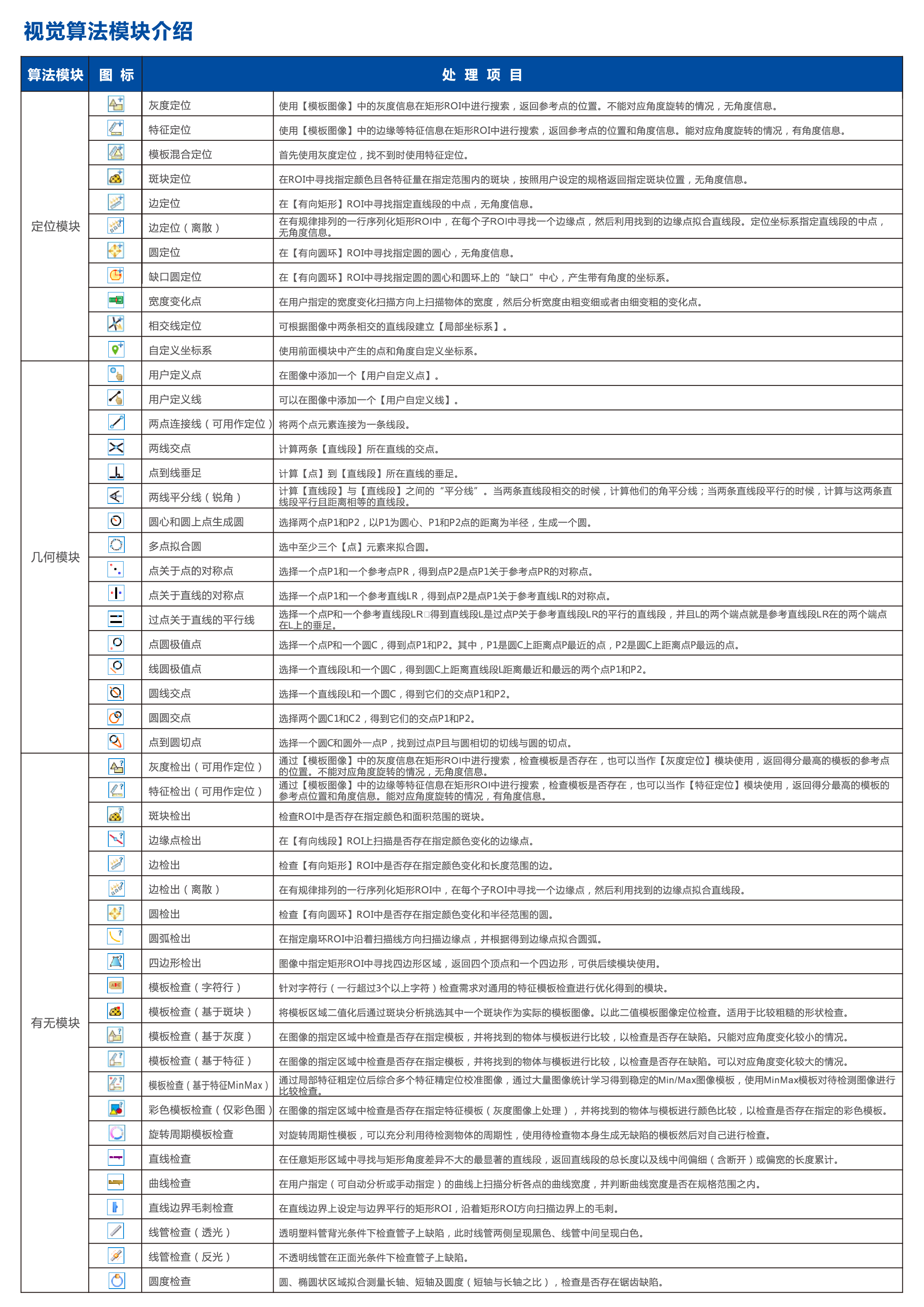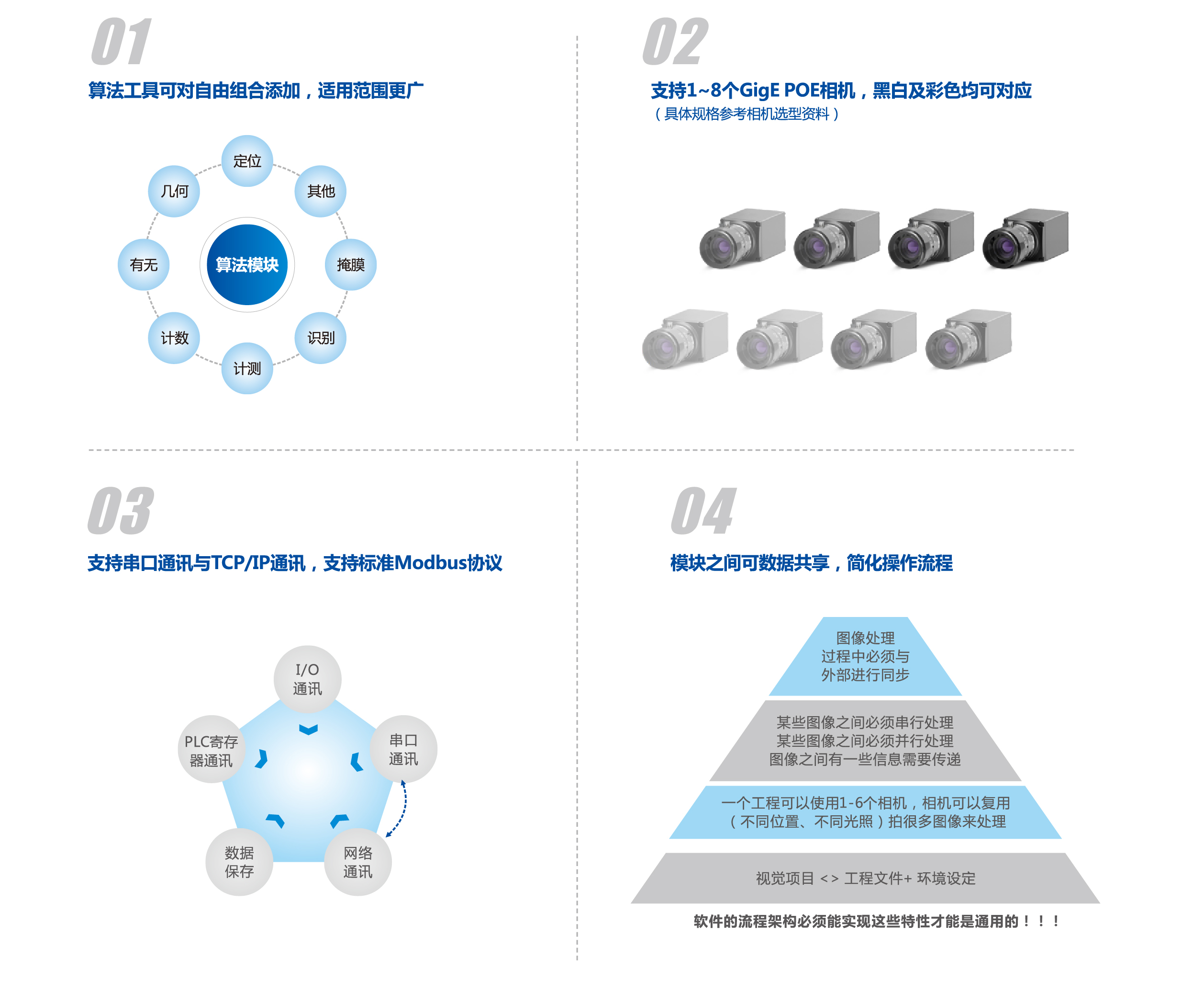 模塊化設(shè)置簡(jiǎn)單快捷,快速對(duì)應(yīng)。 多種多樣的圖像處理功能與視覺(jué)對(duì)位功能,滿足多種多樣的定位對(duì)位、 測(cè)量、 識(shí)別等需求,多種定位對(duì)位補(bǔ)償算法,大大節(jié)約調(diào)試時(shí)間。 多種通訊方式,滿足不同類型的通訊需求。