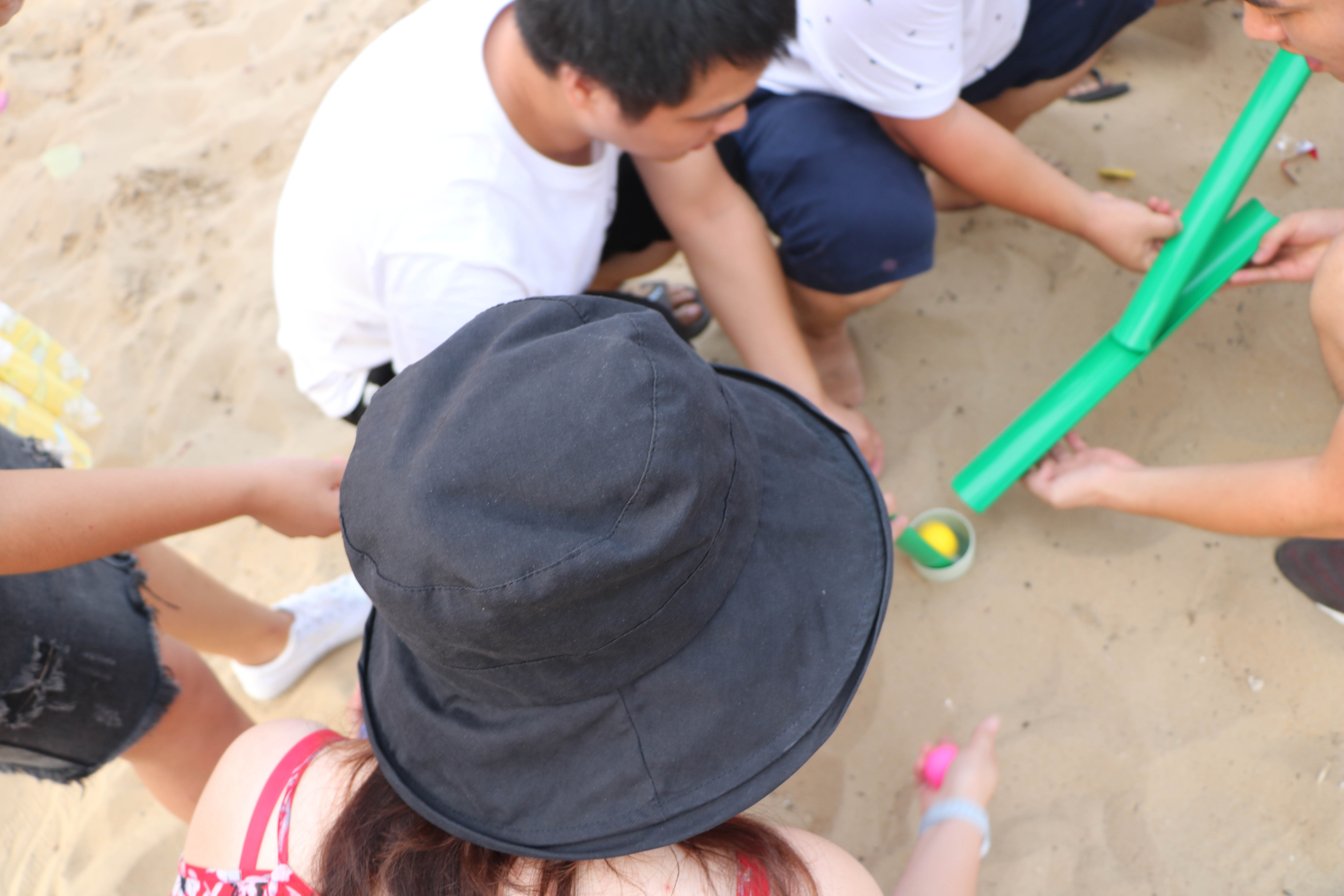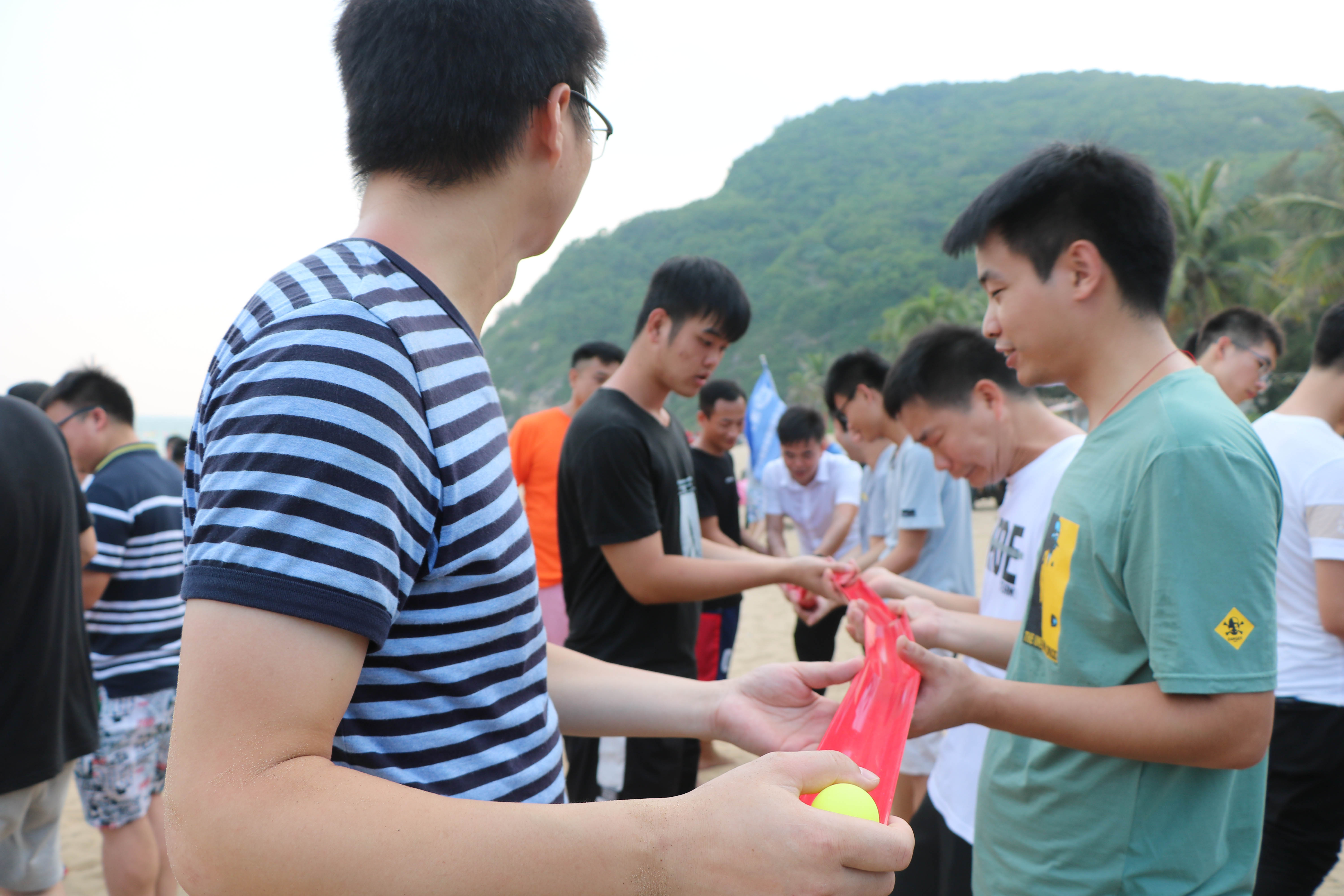 下午大家集合前往沙灘上展開激烈的趣味比賽,大家分為4個小隊,進行對抗,第一個比賽“竹行千里”,這個項目非常考驗每個人的配合默契程度,要用接力的形式讓小球在管子上運動并且運到終點,每個隊伍為了勝利都用了十分的認真功力。