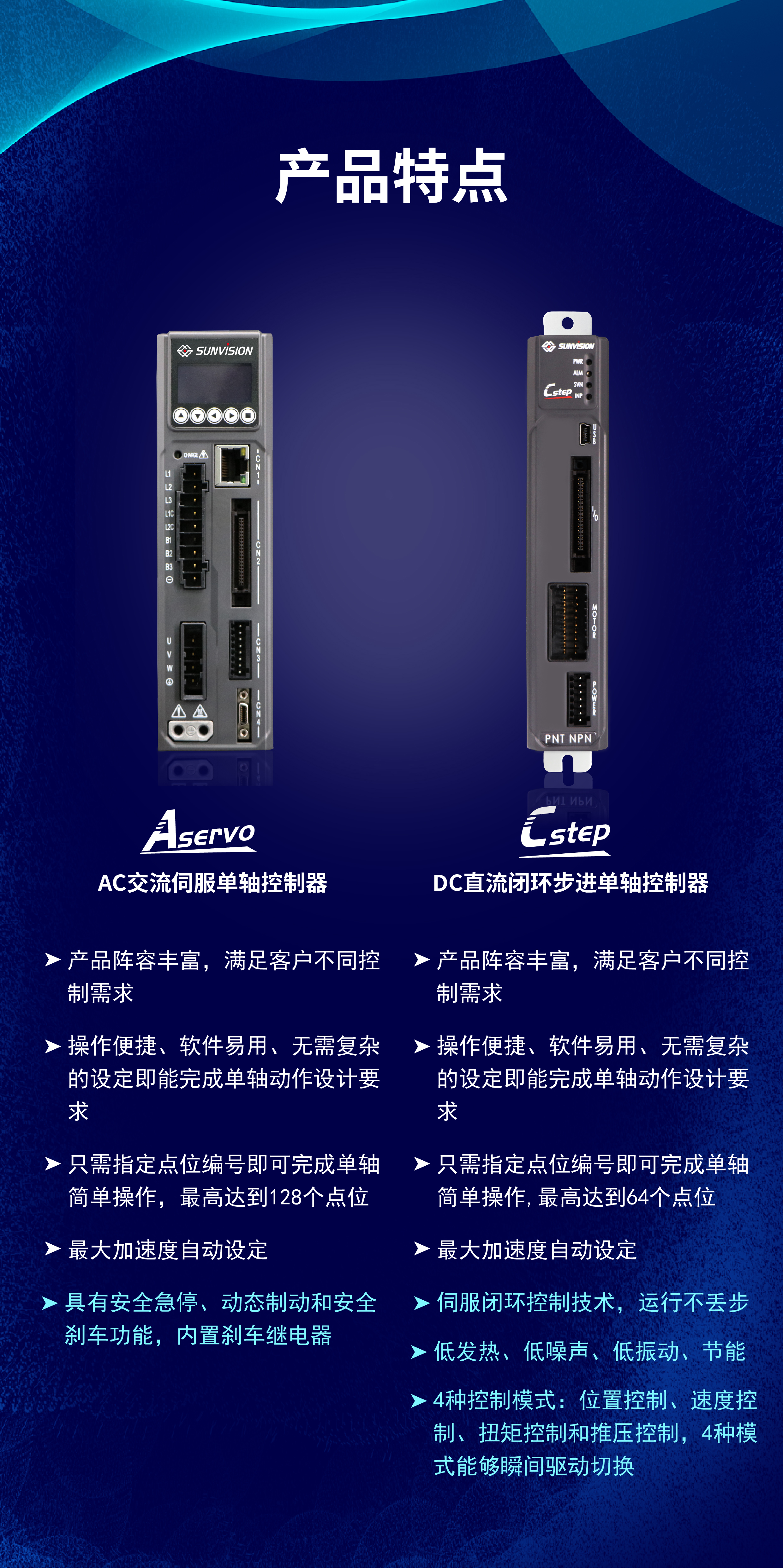在EtherCAT軟運動控制的大環(huán)境下,為了滿足工業(yè)控制領(lǐng)域的實時性和數(shù)據(jù)通信要求,盛為興自主研發(fā)了Aservo系列AC交流伺服以及Cstep系列DC直流閉環(huán)步進(jìn)單軸控制器,兩款控制器均可滿足客戶不同需求,匹配單軸應(yīng)用功能產(chǎn)品,結(jié)合軟運動控制技術(shù)和信息化技術(shù)融合于一身,更好的搭配單軸模組。