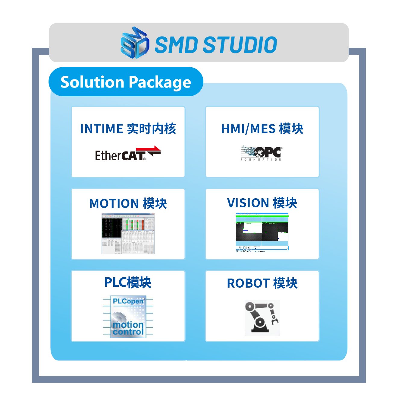 速美達(dá)EtherCAT軟運動整合控制系統(tǒng)——SMD STUDIO,配備軟PLC、運動控制、機器人、人機界面、機器視覺等模塊。采用 windows 系統(tǒng),僅1臺PC可對邏輯、多軸、機器人、視覺進(jìn)行整合處理;通過借助 Intime 實時系統(tǒng)及CPU內(nèi)核分離,能實現(xiàn)高速高精度運動控制;采取 EtherCAT 省配線方式,減少作業(yè)周期,提高工作效率。相比于傳統(tǒng)運動控制,軟運動控制擁有更好的靈活性、可擴(kuò)展性、可維護(hù)性、性價比,更有效的提高企業(yè)產(chǎn)能效率,降低成本。